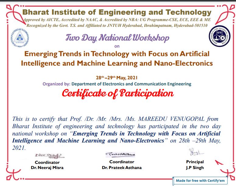 Department of ECE conducted Two Day National Workshop on ‘Emerging Trends in Technology with Focus on Artificial Intelligence and Machine Learning and Nano-Electronics’ during 28th –29th May, 2021