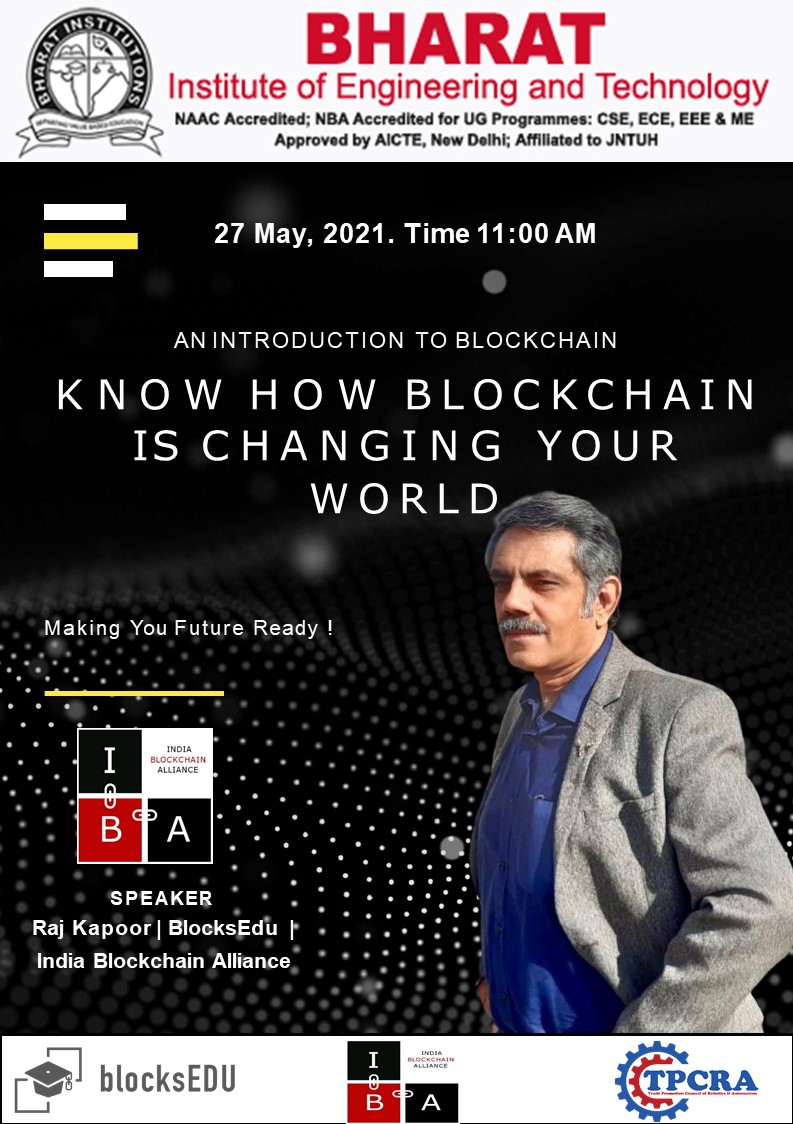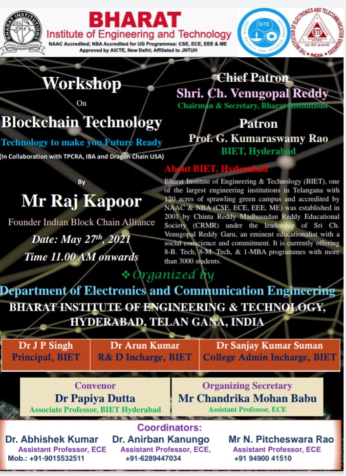 Department of ECE conducted one day online workshop On Blockchain Technology on 27th May in collaboration with TPCRA,IBA and Dragon chain(USA),Resource Person Mr.Raj Kapoor,Foundation Indian Blockchain Alliance
