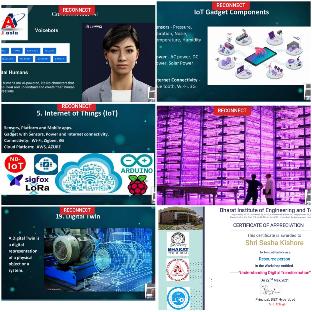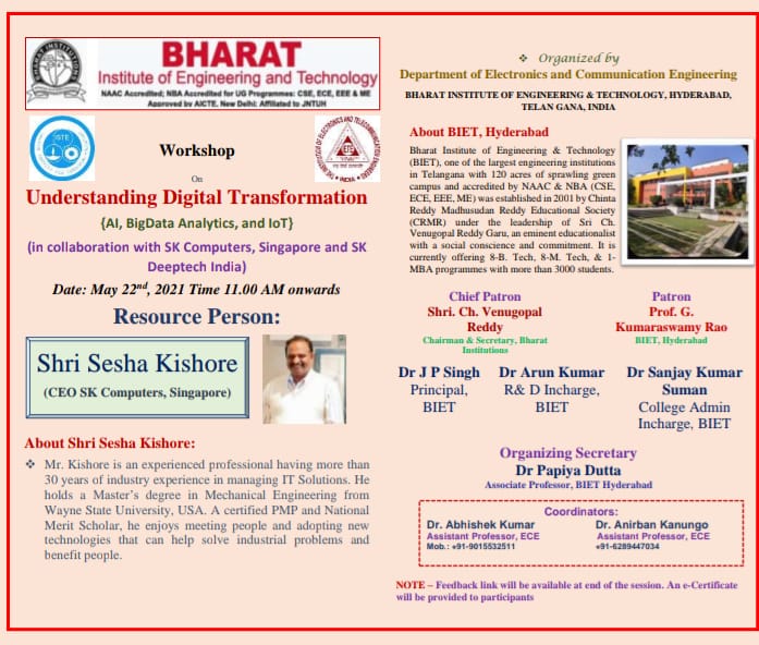 Department of Electronics and Communication Engineering conducted one day online workshop on Understanding Digital Transformation on 22nd May 2021 in collaboration with SK Computers,Singapore and SK Deeptech India,Resource Person Shri Sesha Kishore,CEO ,SK Computers,Singapore