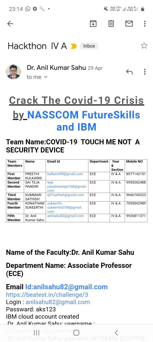 Out of 26000 teams registered and submitted the project for the Hackathon conducted by IBM in association with NAASCOM one of the team name: “COVID19 –Touct me not a Security device “of ECE department under the guidance of Dr.Anil Kumar Sahu qualified in top 15 teams for the final which was held in April-May 2020