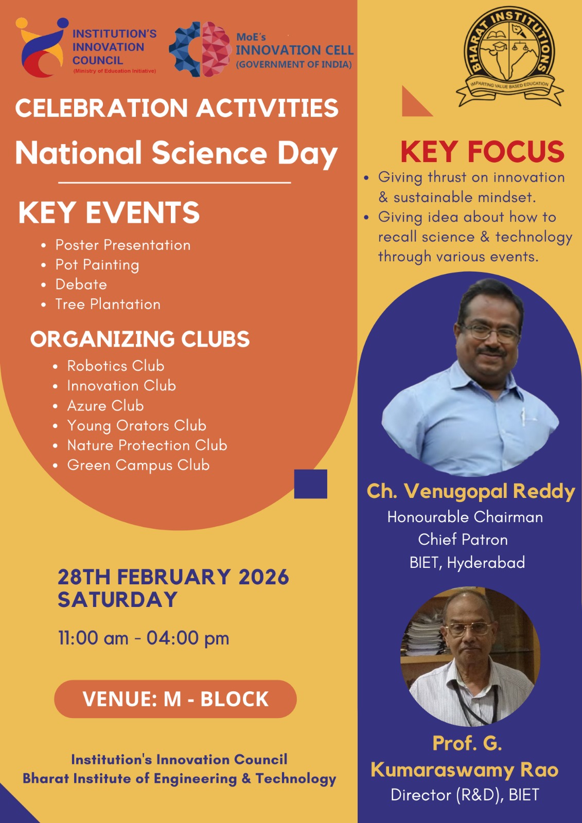 NATIONAL SCIENCE DAY will be celebrated on 28th February 2026 in the BIET Auditorium! THEME: Empowering Indian Youth for Global Leadership in Science and Innovation for Vikshit Bharat Hear from keynote speaker Prof. C Subrahmanyam