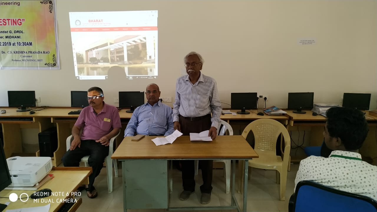 Mechanical Engineering Department has Conducted One Day Workshop on Non Destructive Testing On 23/02/2019 by Eminent Speakers From DRDL,MIDHANI .