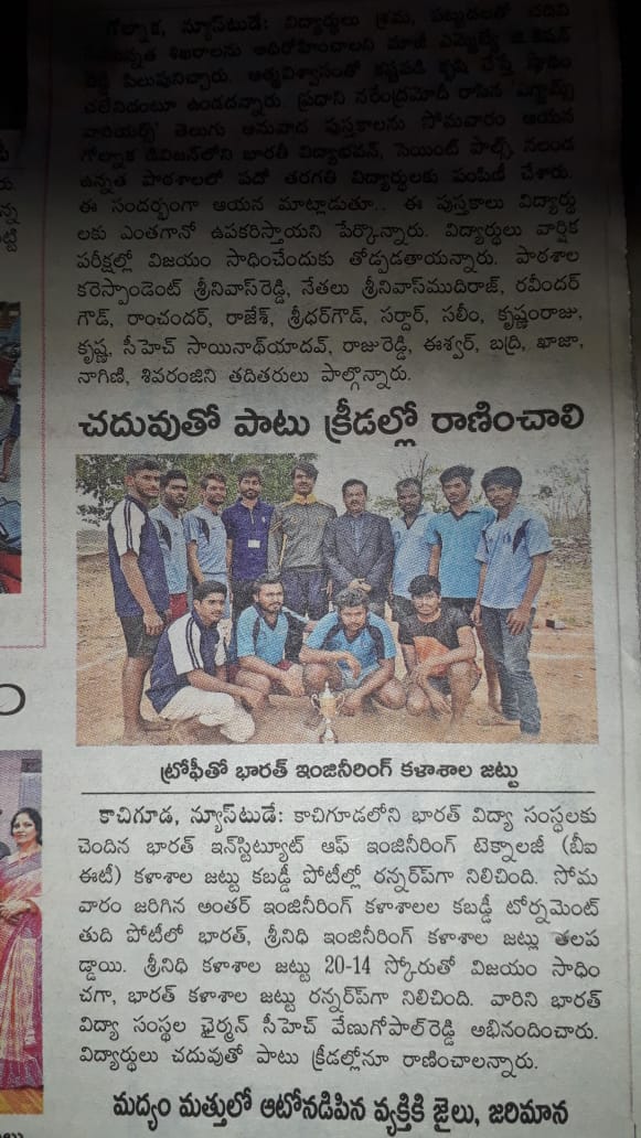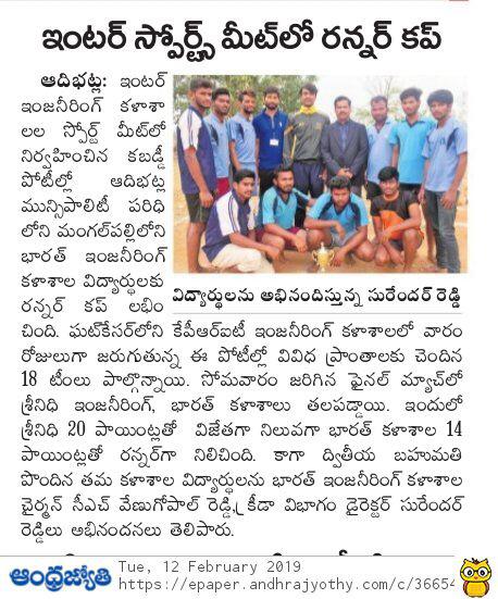 BIET Kabaddi team is the Runners up in the Inter Eng colleges sports meet held at KPRIT Ghatkesar on 7& 8 th feb 2019