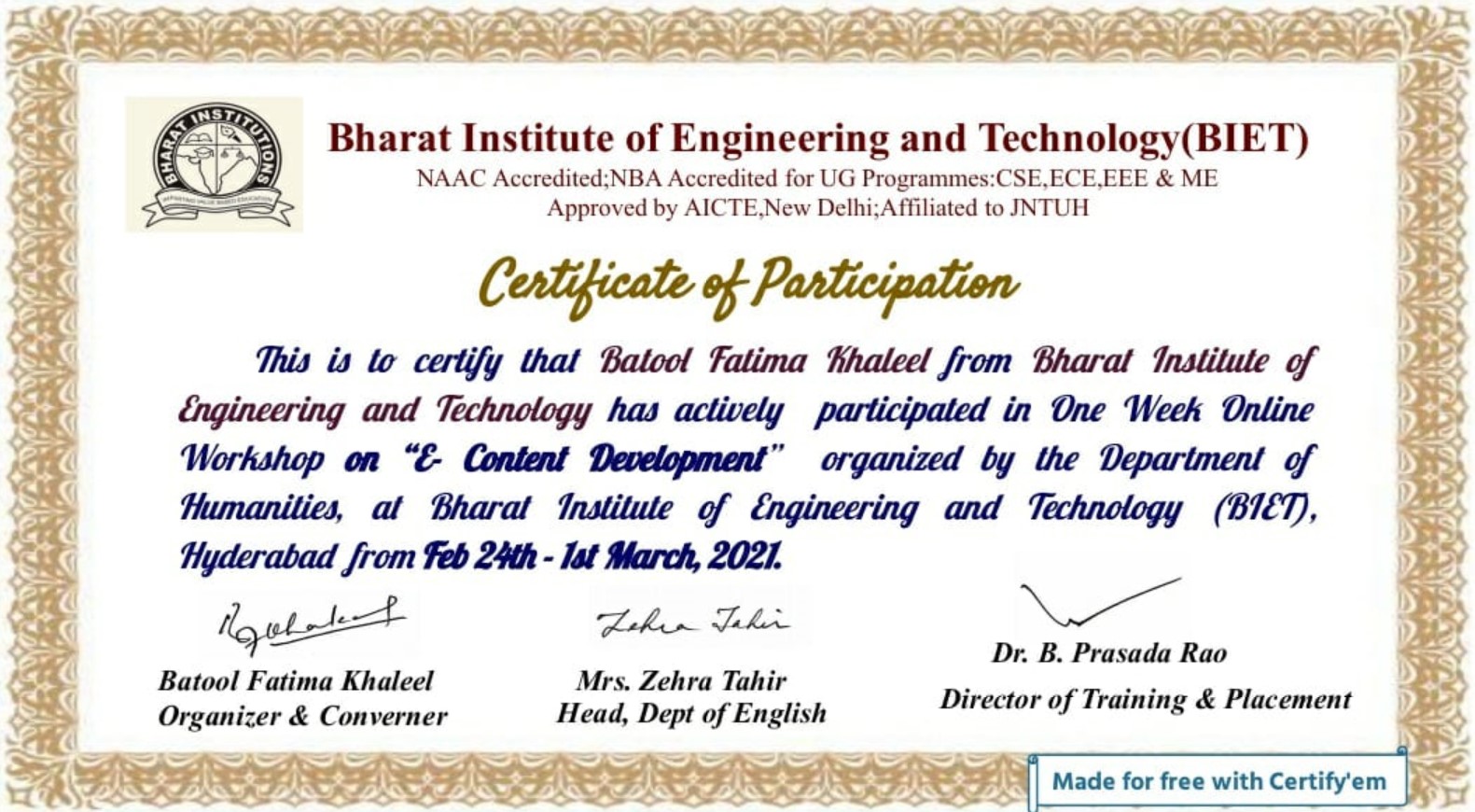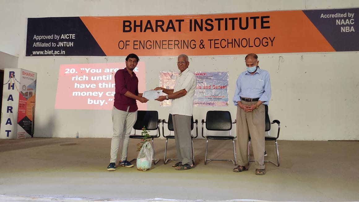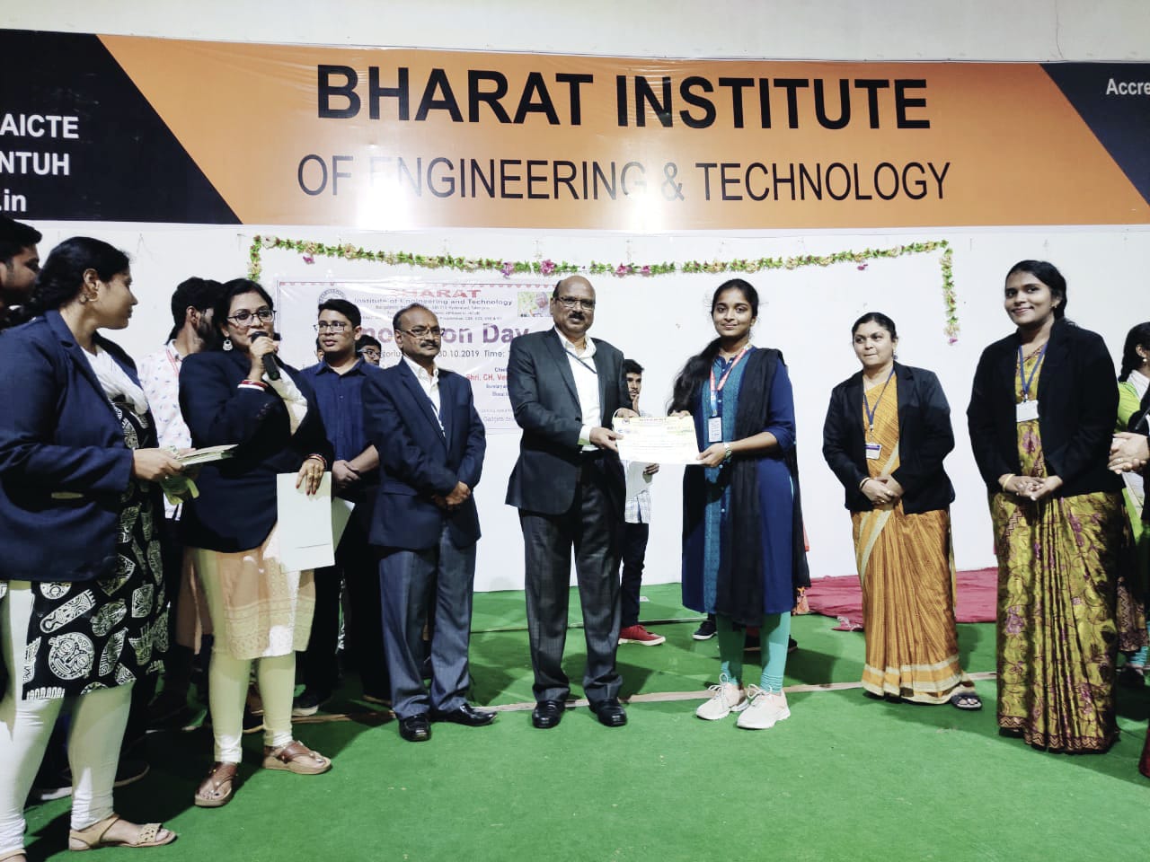 Bharat Institute of Engineering and Technology planned to organize a One Week Induction Programme for the fresh entrants to B.Tech between 25 and 30 November 2020 through online mode due to pandemic. Every day the session begins at 10 AM and finishes at 11: 30 AM through Zoom Platform.