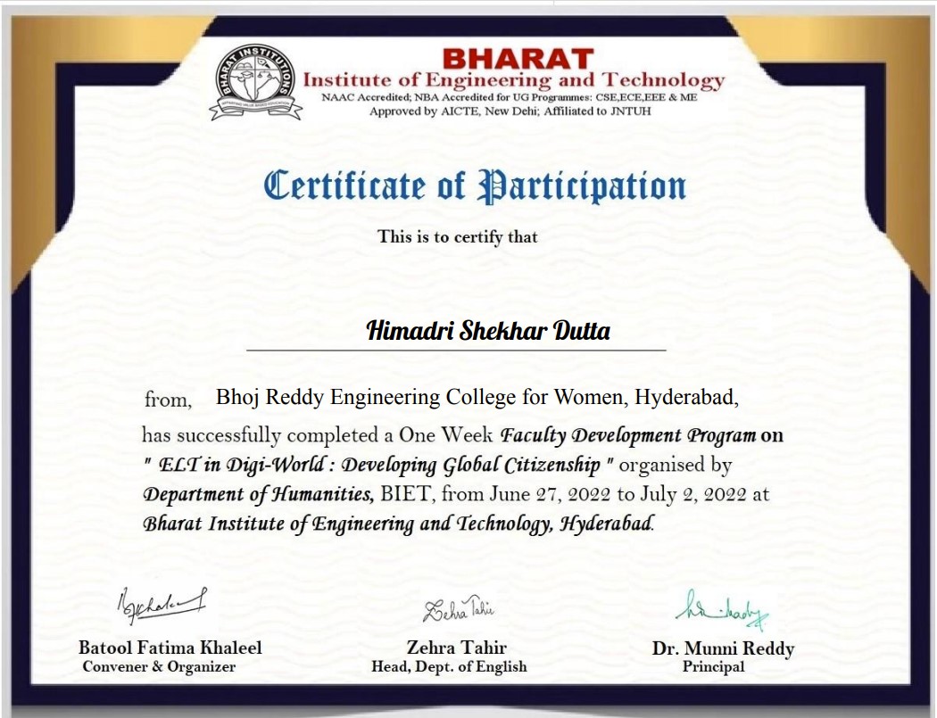 Department of Science and Humanities(ENGLISH)organized One Week online FDP on ELT in Digiworld:Devloping Global citizienship from 27th June 2022 -2nd July 2022
