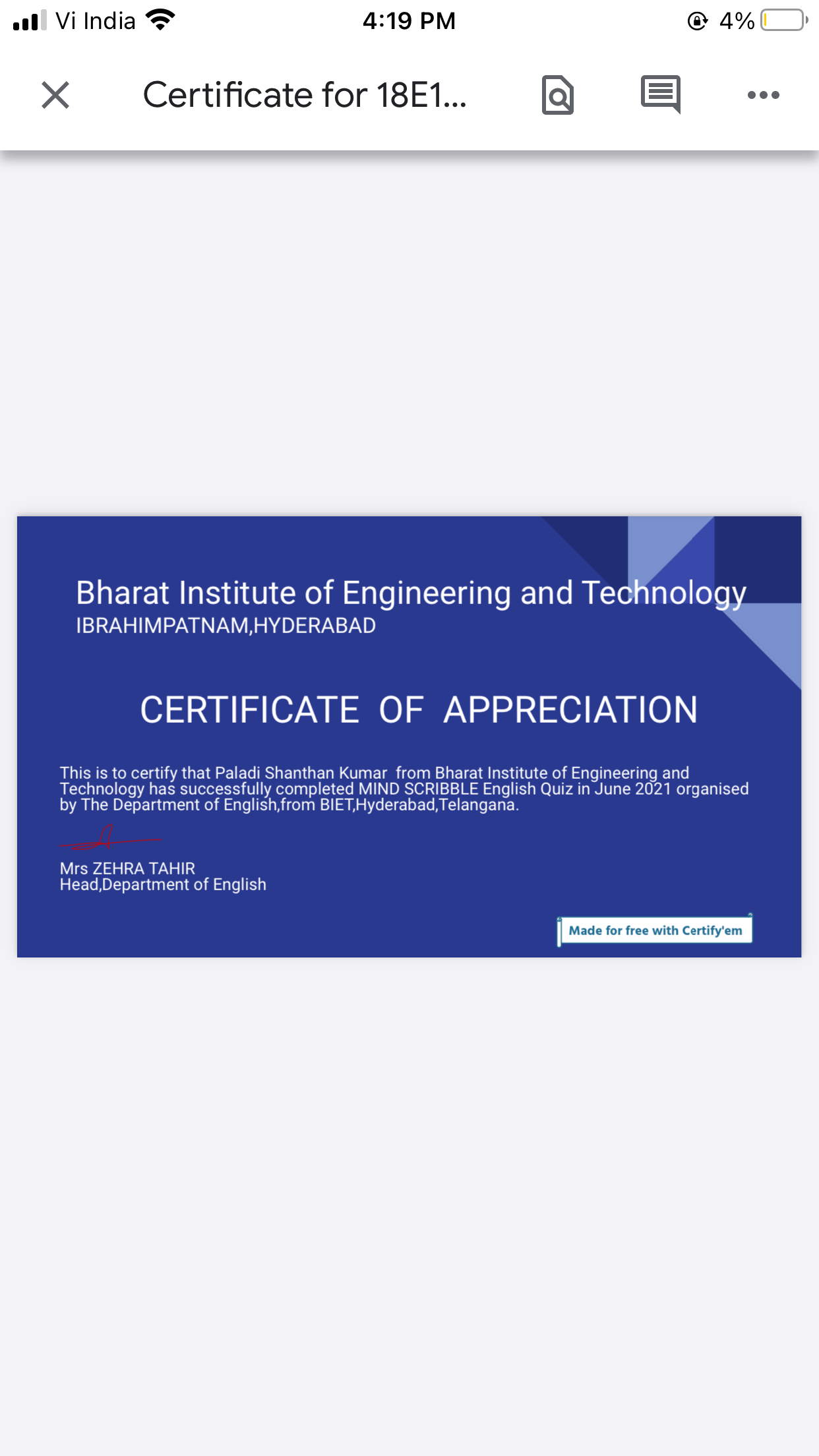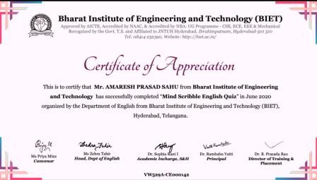 National level Online Quiz was conducted by Department of Science and Humanities (English) on “Mind Scribble English Quiz” in the month of June 2020. E-certificates were awarded to the participants.