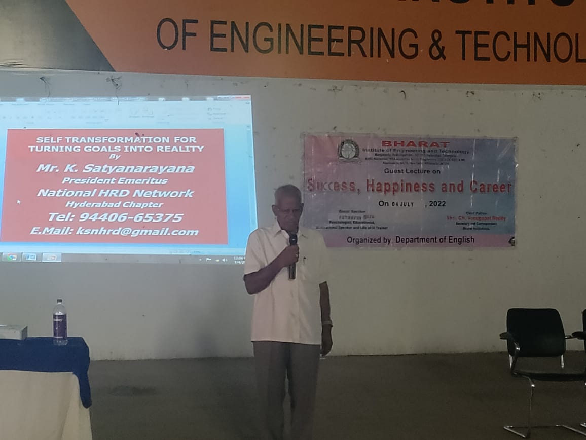 The SCIENCE & HUMANITIES (H &S), Bharat Institute of Engineering and Technology organized a Guest lecture for ALL 1st year students on 14th December 2019. The lecture was addressed by Dr. C.S.SHASTRY, professor, IITH, Hyderabad.