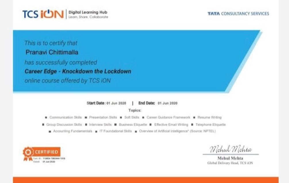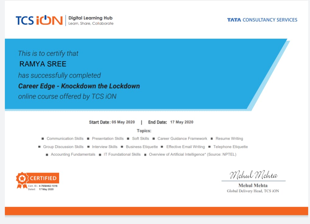 “Career Edge – Knockdown the Lockdown” provided by TCSiON – Digital Learning Hub. This course mainly focused on the necessary skillset demanded by industries