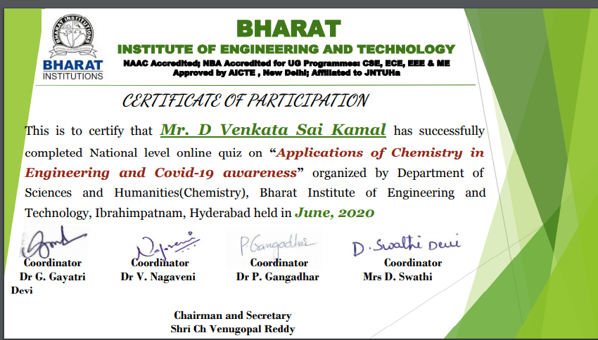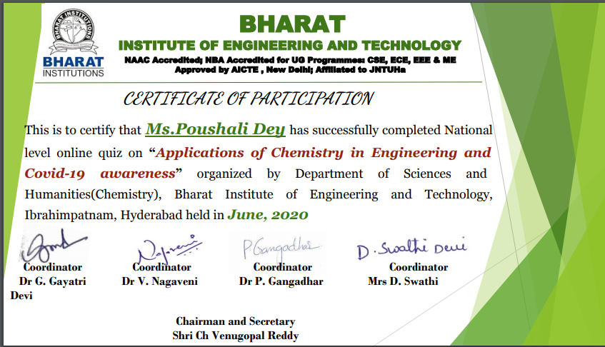 National level Online Quiz was conducted by Department of Science and Humanities (Chemistry) on “Applications of Chemistry in Engineering and Covid-19 Awareness” in the month of June 2020. Total 1200+ participants from different parts of the country participated. E-certificates were awarded to the participants who scored more than 50%.