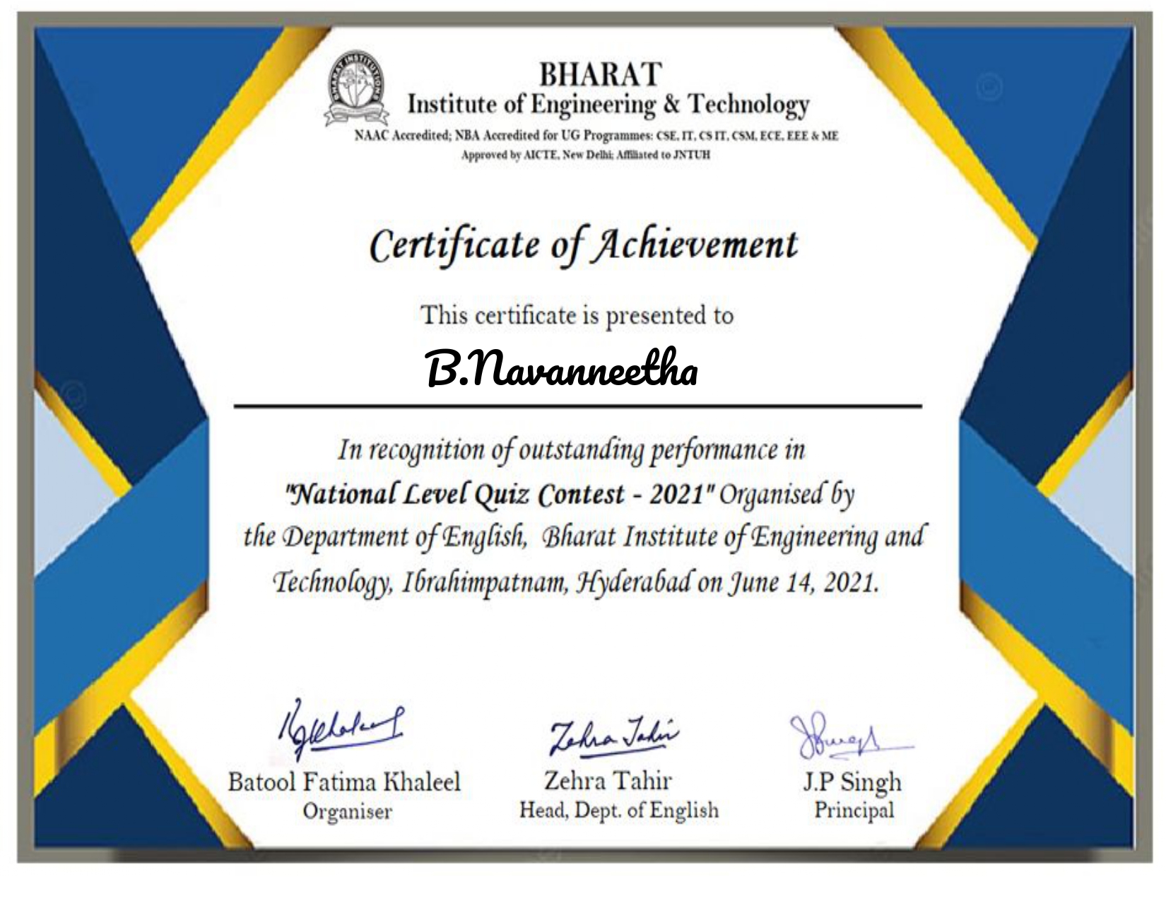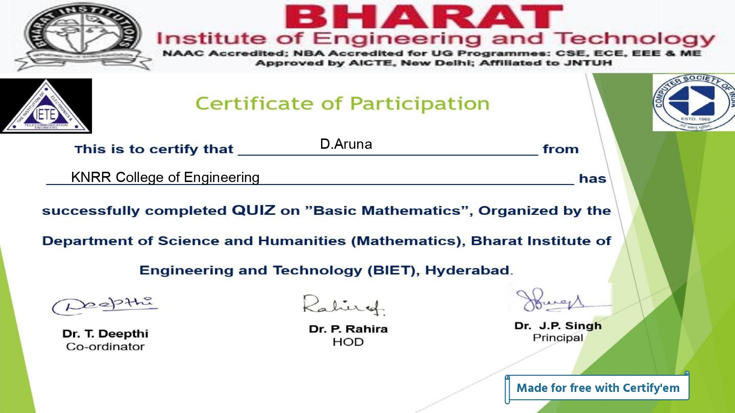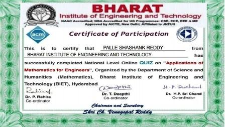 Department of S&H (Mathematics), Bharat Institute of Engineering and Technology organized the National Level Online Quiz on "Basic Mathematics "on 14th June 2021.