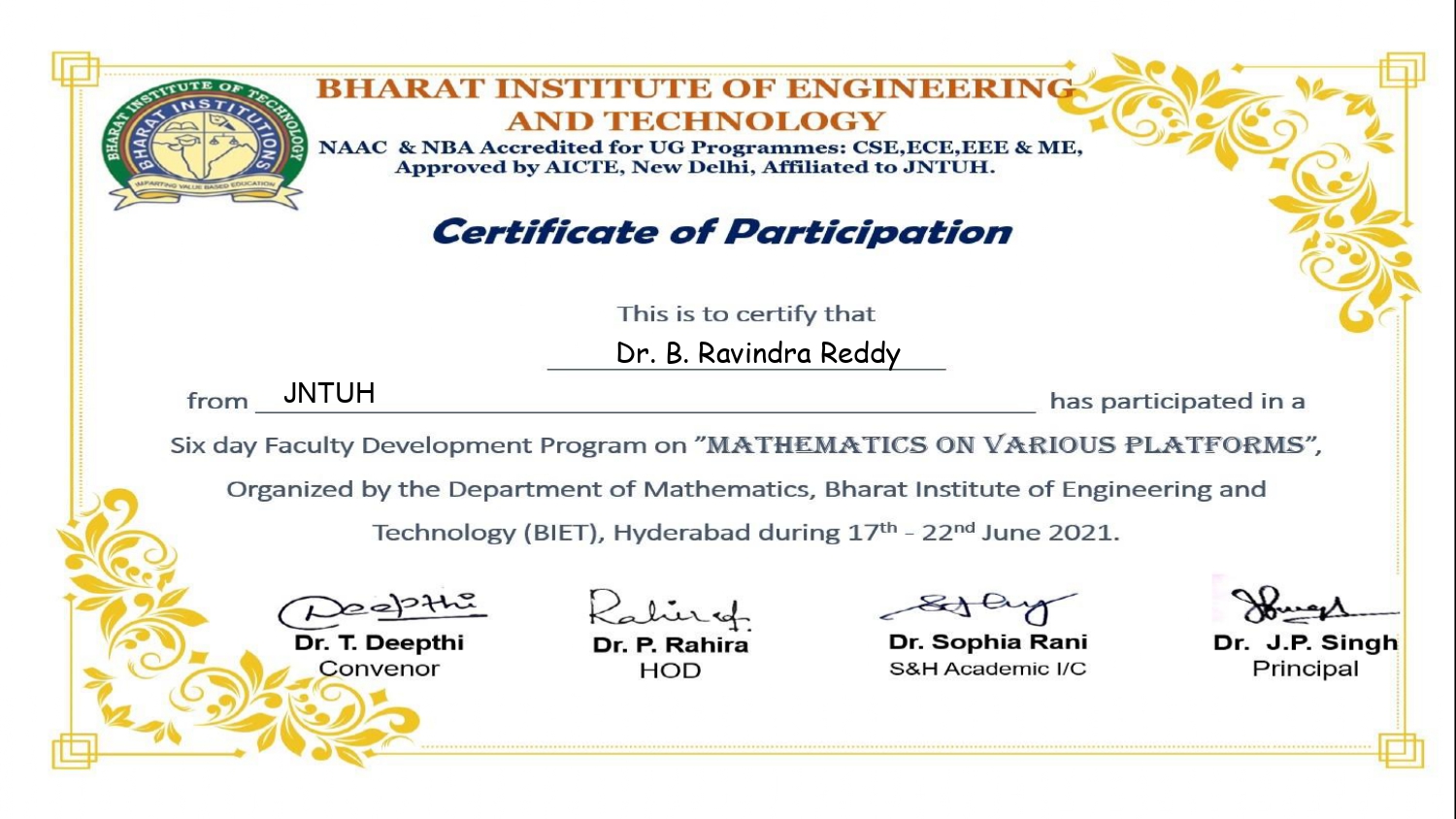 The DEPARTMENT OF SCIENCE & HUMANITIES (H &S), Bharat Institute of Engineering and Technology organized Two Days National Webinar on “Applications of Mathematics for Engineers” on 4th & 5th July 2020.