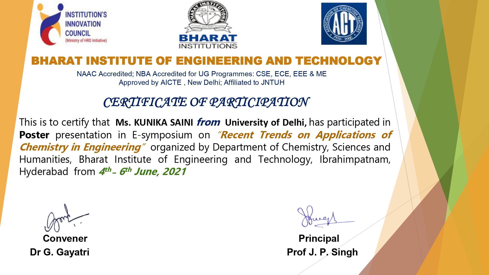 Department of Chemistry conducted a National Symposium on “Recent Trends on Applications of Chemistry in Engineering – RTACE–21” from 4th June 2021 to 6 th June 2021. Resource persons: 1) Prof B Ramadevi, Professor, JNTUH, Hyderabad 2) Dr Raman Vedarajan, Scientist, Centre for Fuel Cell Technology, ARCI 3) Prof Ravindra Kulkarni, Professor, Bharati Vidyapeeth, Poona College of Pharmacy, Pune. E-certificates for all the participants and oral/poster presentations were provided. Abstracts for the same were included in conference proceedings.