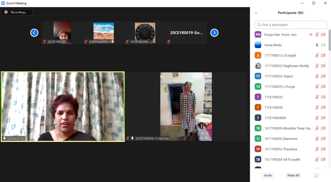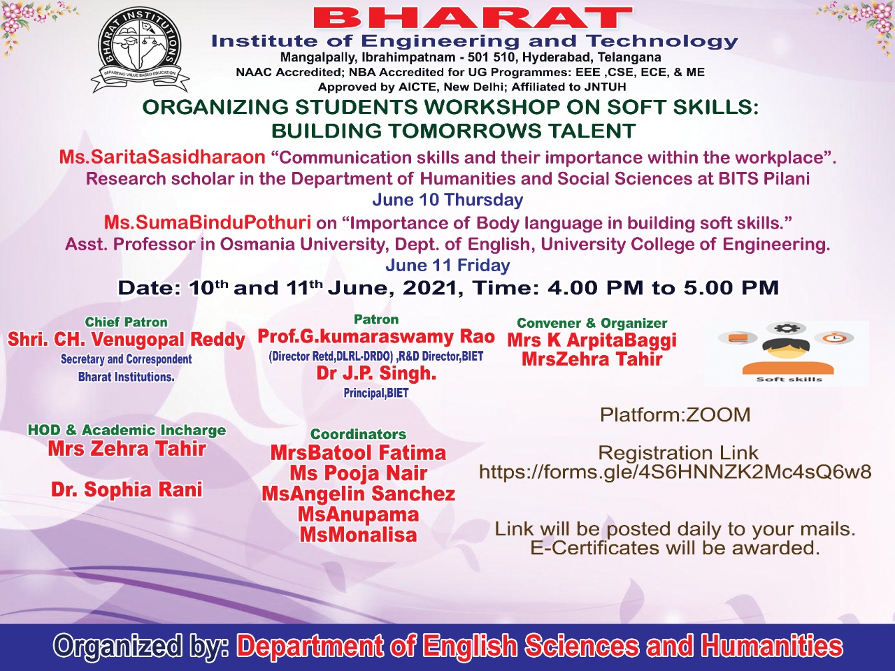 Department of English organized online Student Workshop on Soft Skills : Building tomorrows Talent on 10th and 11th June 2021, Resource person: Ms.Sarita Sasidharan,Research Scholar BITS Pilani,Ms. Suma Bindu P,Asst.Professor Osmania University