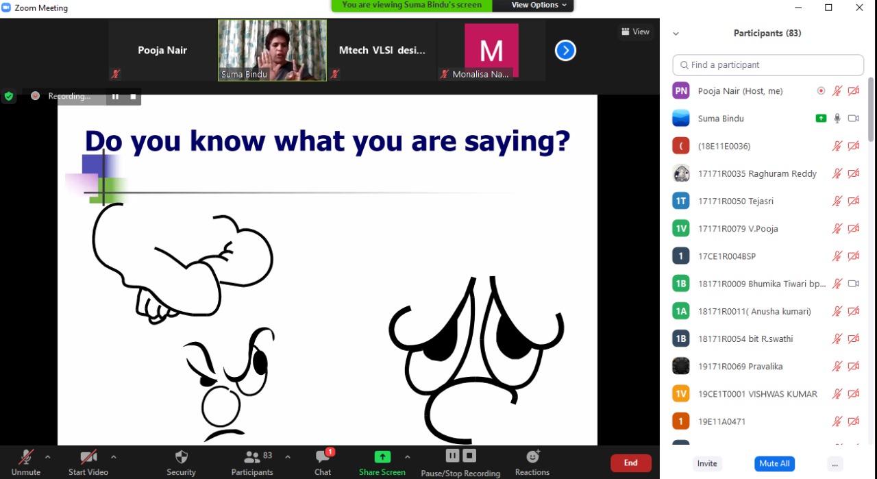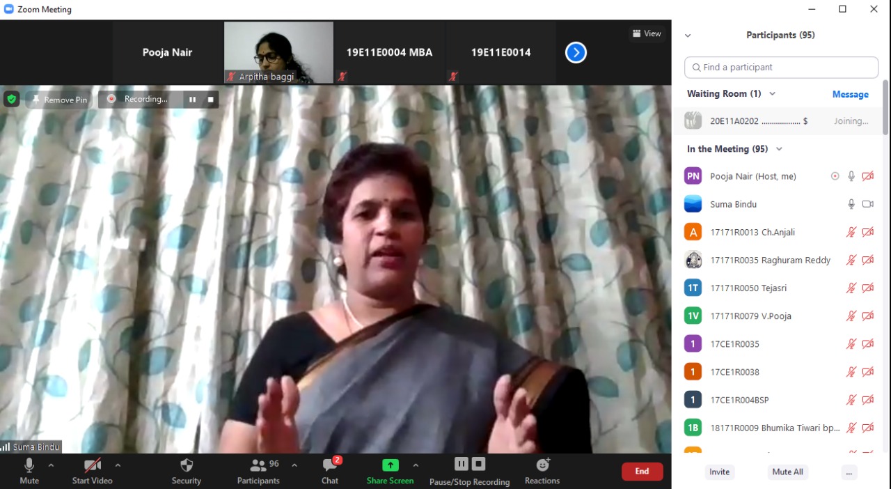 Dr. J MADHAVI informed us about how Gender Sensitization takes place in the society, such as socialization, which includes family and society, education, media and language. This lead us to think how much a person’s upbringing may affect a person’s thought process. This session was very impressive, interactive and thought provoking for the students as well as faculty members where she answered all the queries put up by the students to their full satisfaction.