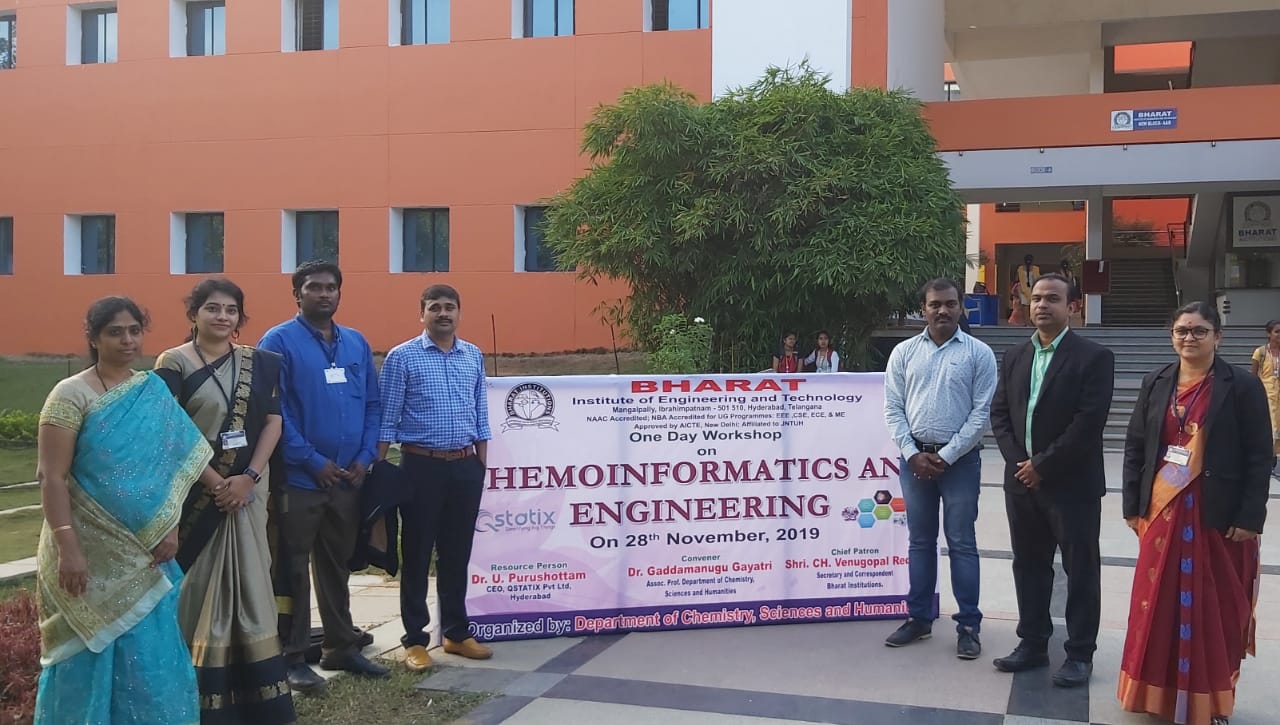 Department of Chemistry, Sciences and Humanities, organized a one day Workshop on "Chemoinformatics and Engineering" on 28th November 2019. Around 160 Students from 1st Year registered in the workshop and got benefited.The workshop started with an inaugural session which was followed by the lecture by Dr U purushottam, CEO, QSTATIX Pvt Ltd. The afternoon session was scheduled for hands on session by Dr T Karunakar, Director, QSTATIX Pvt Ltd, wherein participants used computational softwares and tools to understand the applicability of tools in solving problems.