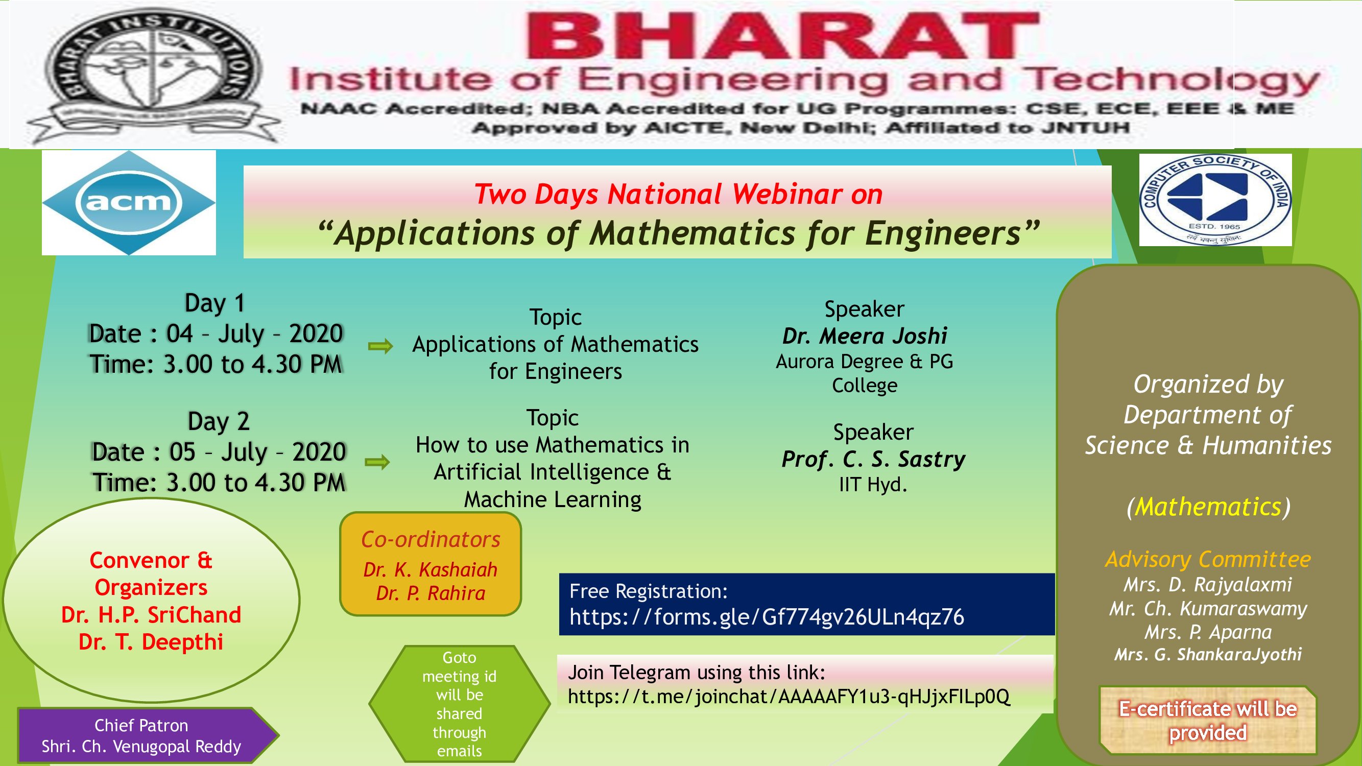 The DEPARTMENT OF SCIENCE & HUMANITIES (H &S), Bharat Institute of Engineering and Technology organized Two Days National Webinar on “Applications of Mathematics for Engineers” on 4th & 5th July 2020